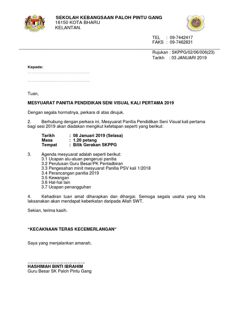 Contoh Surat Panggilan Mesyuarat Guru Kali Pertama